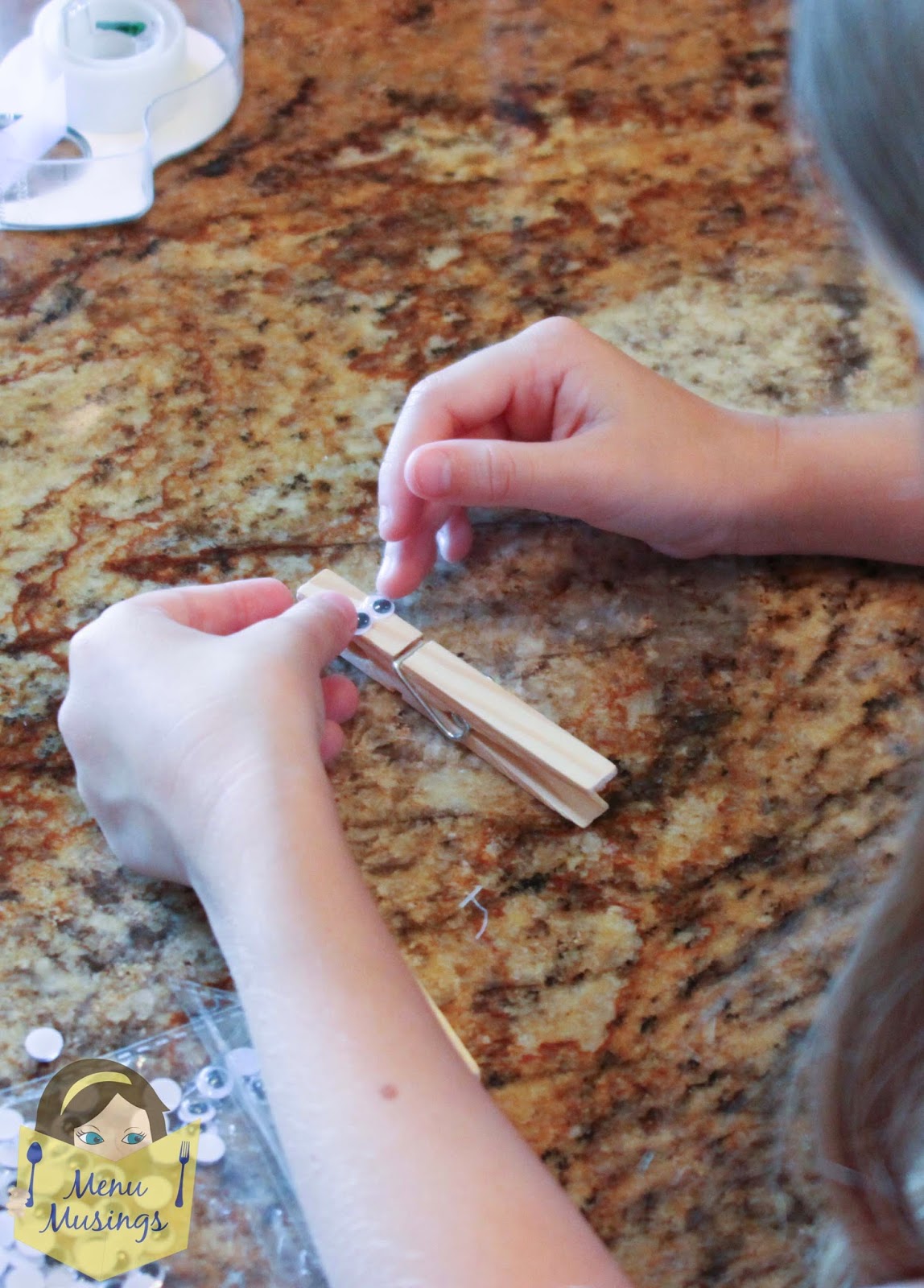 I recommend gluing the googly eyes onto the clothespin first, so they will have time to dry.