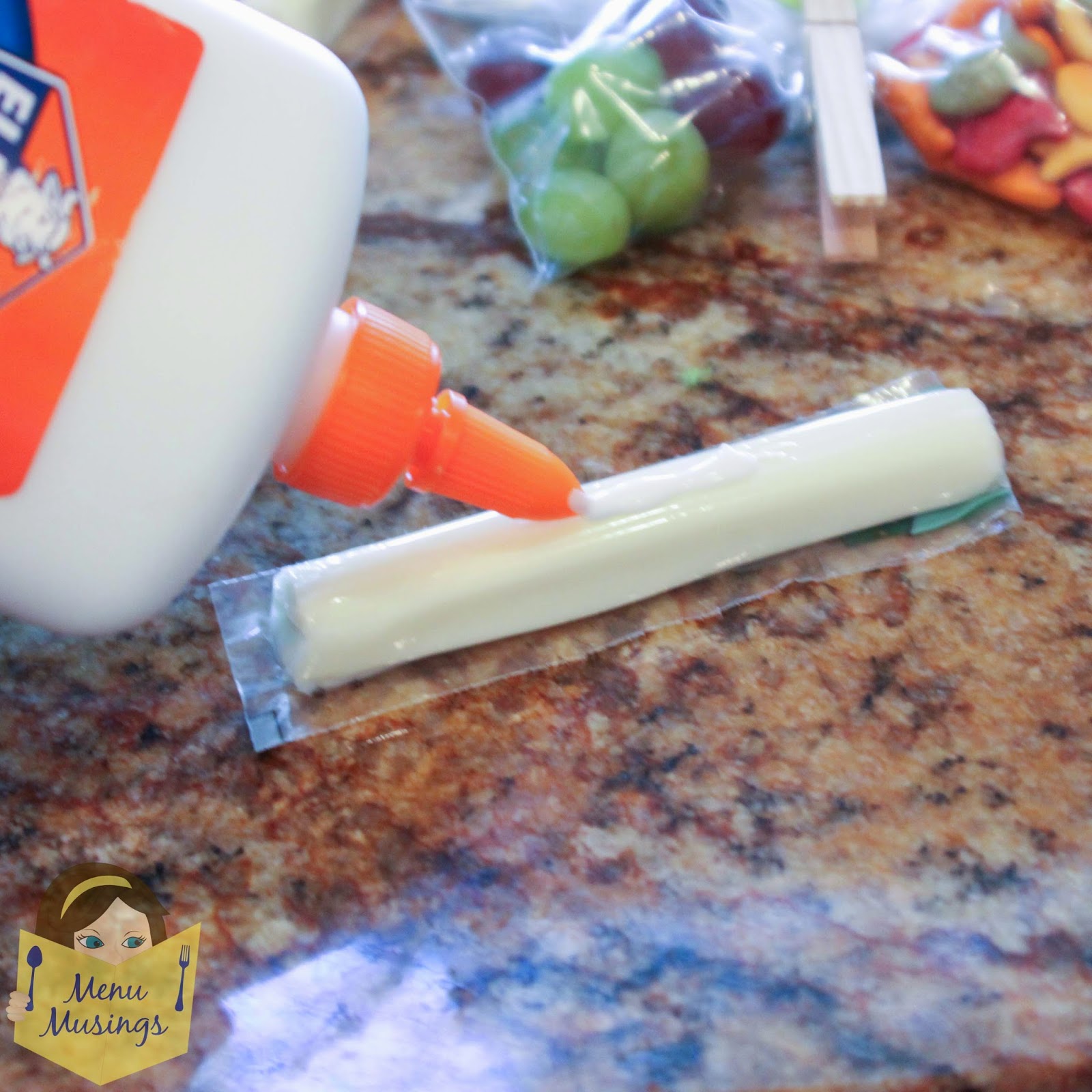 I used Elmer's Glue-All on the rounded side of the string cheese so that it would rest on the flat side for more stability.