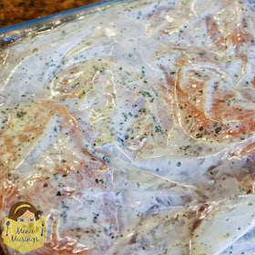 Step 2. Prepare the chicken. I purchased "thinly cut" chicken breasts as a time saving step. I placed them into a big gallon-sized zip-top bag and pounded them out, just to make sure that they were uniform thickness. That will accomplish a few of things. First, it will make sure that they cook uniformly. Second, it will tenderize them. Third, if they are even thinner, they will cook even faster. Now dump the marinade into the bag over the flattened chicken. You can work the marinade around to make sure it's all evenly distributed and then just shove the chicken in the fridge somewhere for a few hours and go about your business. I love marinating things in a zip-top bag. It takes up so much less space because you can just squish it somewhere.