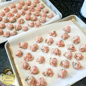 Cooks note: If you are making this all at once, you obviously don't have to freeze the meatballs first. Just have a pan ready for as many of the baked meatballs as you'd like for your family's dinner. They are each 1/2 ounce, so depending on your family I recommend a serving of 6 meatballs each for a 3oz portion of meat. But you know your family best. Some of you have grown people and teens while others have toddlers and littles.